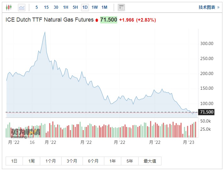 截至发稿,基准荷兰 TTF 近月天然气期货价格上涨 2.83%,至 71.5 欧元/兆瓦时。