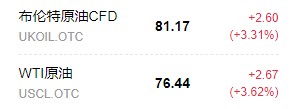截至发稿,布伦特原油期货涨 3.31%,至每桶 81.17 美元;WTI 原油期货上涨 3.62%,至每桶 76.44 美元。