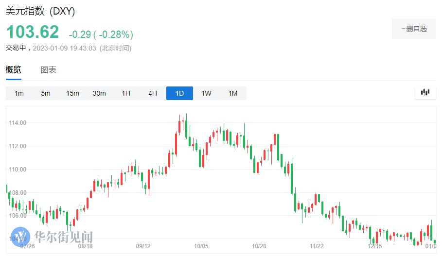 美元指数在上周五跌 1.15% 后,周一继续下跌,接近七个月低点,上周五公布的非农数据传通胀利好,市场预期美联储可能放慢加息步伐。