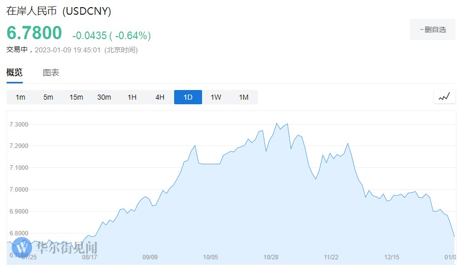 离岸人民币兑美元汇率接近五个月来的最高水平,截至发稿报 6.7931。