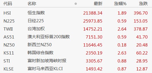 在台积电及联电等芯片股强劲上涨带动下,台湾加权指数飙升 2.64%;韩国综合指数也上涨 2.63%。