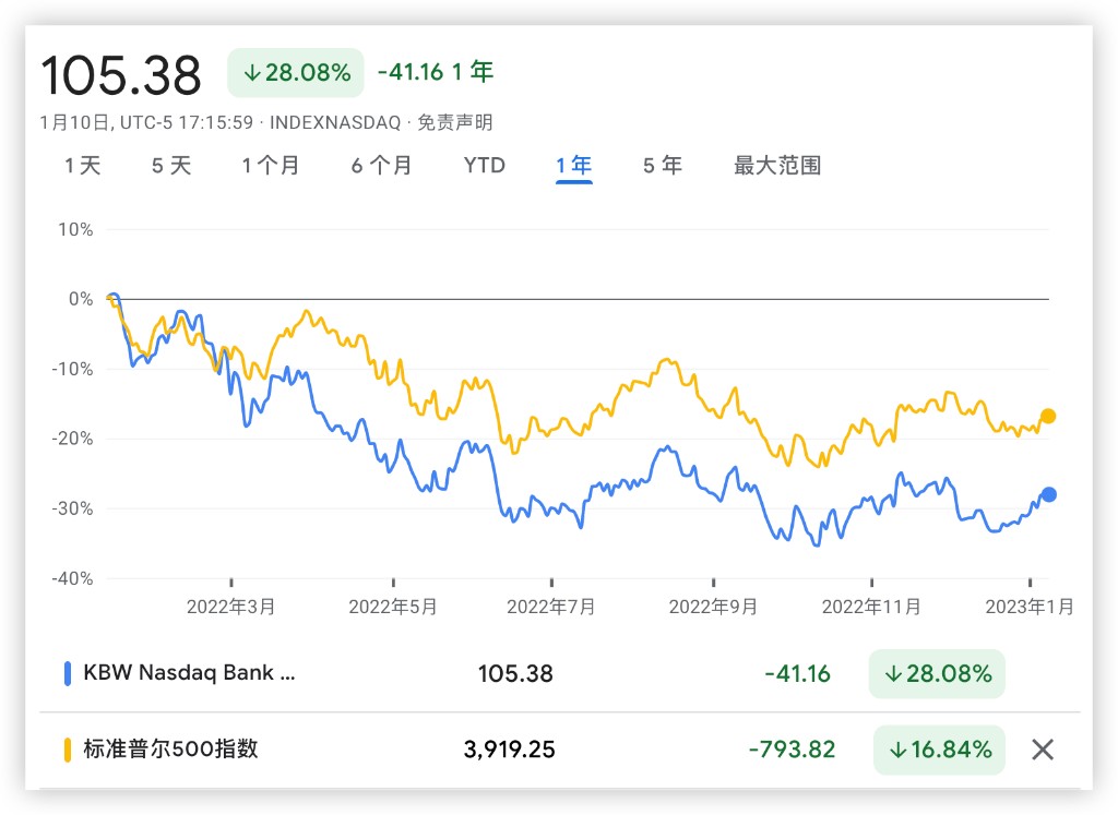 2022 年,追踪大型银行股价的 KBW 纳斯达克银行指数跑输了标普 500 指数。要知道,去年已经是标普 500 指数自金融危机后表现最差的一年,而银行股表现甚至更差。