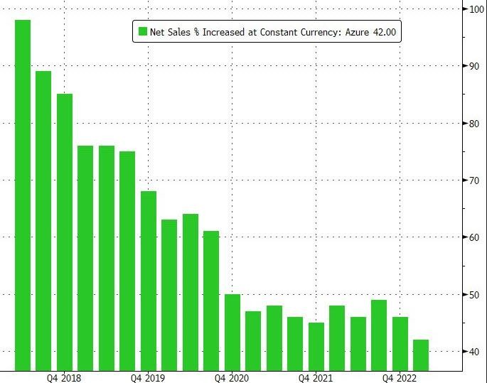 业绩电话会上,微软称,在四季度增长逾 30% 的基础上,一季度 Azure 云计算业务的增速会再放缓 4 或 5 个百分点,预计 2023 财年下半年,商业销售增长将放缓。微软股价盘后转跌。