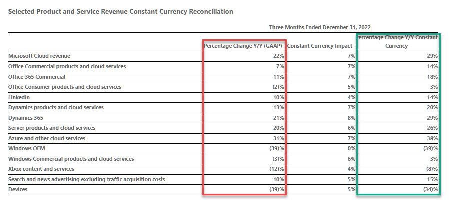 以下财报截图展示了,四季度微软各主要业务在未调整的 GAAP 口径下同比增长,以及不计美元汇率影响、以固定汇率计算的同比增长,从中可以发现,Dynamics 365 业务所受影响最大,增速下降了 8 个百分点,云业务的收入增速因此下降了 7 个百分点。