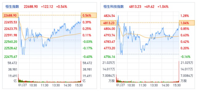 1 月 27 日周五,港股小幅高开,早盘恒指、恒生科技指数一度双双转跌,午后两大指数震荡上扬,且尾盘均有拉升。