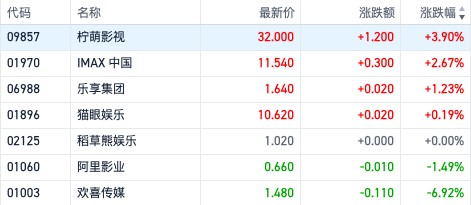 电影概念板块收涨 0.59%。其中,柠萌影视涨近 4%,IMAX 中国涨超 2%;欢喜传媒跌近 7%,阿里影业跌超 1%。