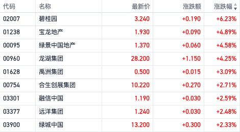 碧桂园收涨 6.23%,宝龙地产、龙湖集团涨超 4%。