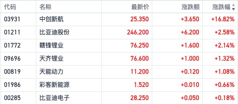 中创新航涨近 17%,赣锋锂业涨超 2%,天齐锂业涨超 1%。