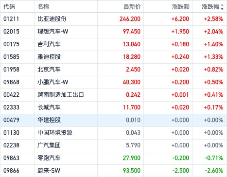 比亚迪股份涨超 2%,理想汽车涨超 2%;蔚来跌 2.6%。