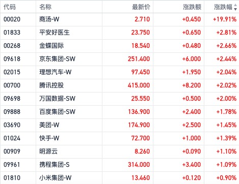商汤科技收涨 19.91%,京东集团、腾讯控股涨超 2%,百度、美团、快手涨超 1%。
