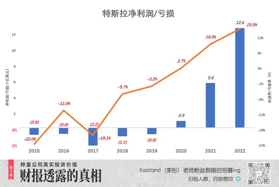 2020 年,特斯拉获得微利;2021 年、2022 年净利润分别为 56 亿美元、126 亿美元;2022 年净利润率达 15.5%。