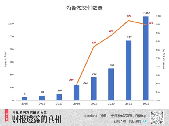 2021 年、2022 年,Model 3/Y 合计交付 91.1 万台、124.7 万台,分别占当年总交付数的 97.3%、94.9%。
