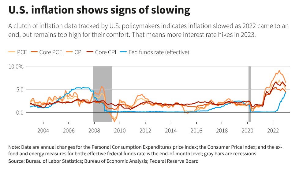 这正是金融市场已经反映出的情况:3 月份将结束加息,本轮加息周期的政策目标将定格在 4.75%-5% 之间,随后将从今年年底前开始降息,因为许多经济学家预计此举将缓解通货膨胀和经济衰退。至少从去年 12 月开始,美联储政策制定者都认为 2024 年之前不会降息。