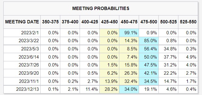 美联储于美东时间 1 月 31 日至 2 月 1 日召开政策会议 (北京时间周四凌晨 3 点公布利率决议),市场普遍预计本次会议将宣布加息 25 个基点,使基准利率达到 4.5%-4.75% 的区间。这比去年 12 月大多数美联储政策制定者认为 “足够严格” 以控制通胀率的水平低了大约 50 个基点。