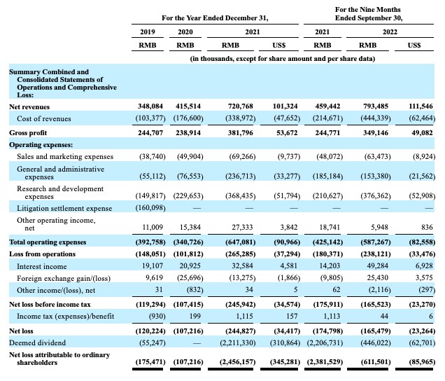 2019 年至 2021 年,禾赛科技的净亏损分别为 1.20 亿元、1.07 亿元和 2.45 亿元;2022 年前三季度,禾赛科技的净亏损为 1.65 亿元,较 2021 年同期 1.75 亿元的净亏损有所收缩。
