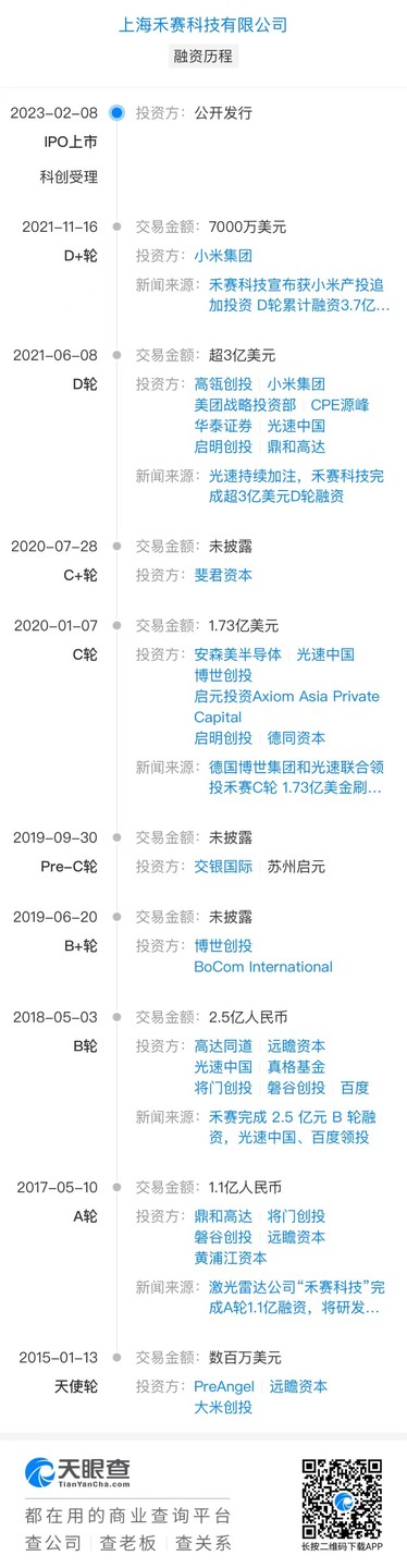 在上市前,禾赛已经完成九轮融资,累计融资超过 5 亿美元,投资人包括光速中国、真格基金、高瓴创投、百度、德国博世、小米、美团等知名机构或公司。