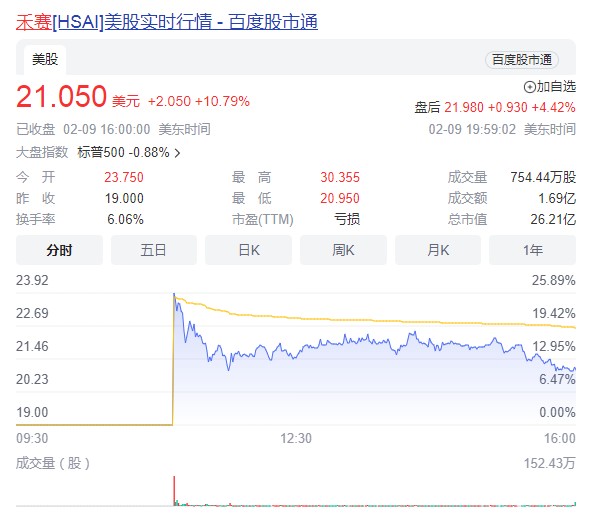 如今,月度出货量过万颗的禾赛科技已顺利成为国产激光雷达第一股,于 2 月 9 日晚间成功登陆美股市场,估值 24 亿美元,上市第一天涨幅 10.79% ,截至 9 日美股收盘,其市值约 26 亿美元。