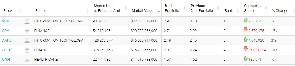 从持仓来看,在前五大重仓股中,微软 (MSFT.US) 位列第一,持仓约 9302.11 万股,持仓市值约为 223.08 亿美元,占投资组合比例为 2.94%。