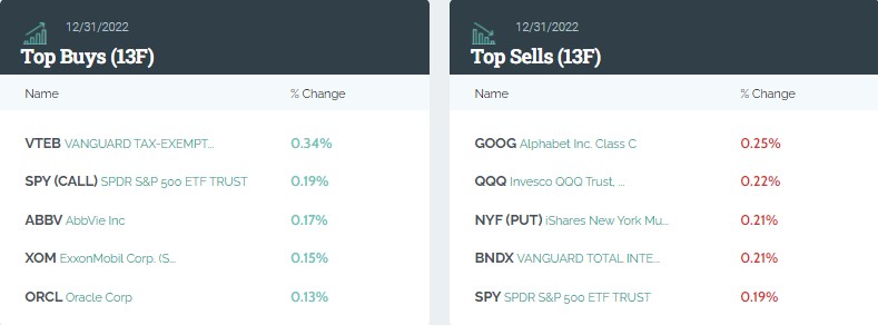 从持仓比例变化来看,前五大买入标的分别是:领航免税债券指数 ETF(VTEB.US)、标普 500 指数 ETF 看涨期权 (SPY.US,CALL)、艾伯维、埃克森美孚 (XOM.US)、甲骨文 (ORCL.US)。
