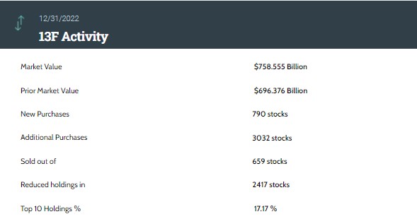 据统计,摩根大通第四季度持仓总市值为 7585.55 亿美元,上一季度总市值为 6963.76 亿美元,环比增长 8.93%。摩根大通在第四季度的持仓组合中新增了 790 只个股,增持了 3032 只个股。同时,摩根大通还减持了 2417 只个股并清仓了 659 只个股。其中前十大持仓标的占总市值的 17.17%。