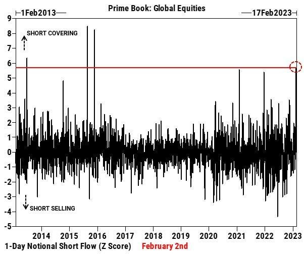 高盛主经纪商业务估算,2 月 2 日、即美联储会后次日的去敞口——即空头回补和买空合计规模创 2021 年 1 月以来新高,超过了过去十年内 99.9% 的水平。