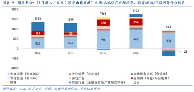 增量拆分:电商不仅规模占比最高而且是增量主要贡献方,互联网行业(网服 + 平台电商)、教育、游戏等行业均在 22 年贡献了负增长,拖累 22 年的大盘增速。