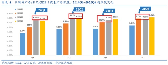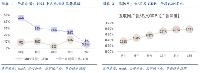 广告行业历来是宏观经济的晴雨表,我们对 2022 年的复盘也将先从宏观开始。复盘 2022 全年表现:互联网广告行业增速预计收官至 6.1%,为过去五年最低增速,略高于全年名义 GDP 增速 5.8%。我们定义互联网广告收入和名义 GDP 的比值为“互联网广告深度”,代表互联网广告占整体经济活动的份额,可以看到:2017~2020 年为互联网广告深度快速提升的四年,因此 2020 年即使 GDP 增速一般,线上广告仍取得了同比 28% 的不错增长;而从 2021 年开始广告深度提升趋势显著放缓:一方面是由于自 21 年中开始对教育、互联网金融、游戏等行业的监管导致需求端部分行业广告投放规模受到影响,另一方面也由于《个保法》对个人信息使用的规范、移动互联网时代流量的见顶等导致供给端广告库存和单位广告的精准度受到影响。