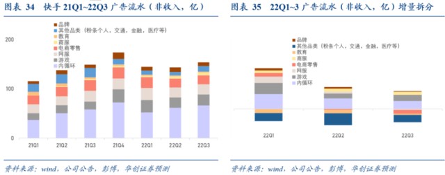 看 22 年全年增速,快手广告整体增速和内外循环的分别增长均跑赢行业大盘。但如果分季度拆分,快手的广告增速自 Q2 开始明显下滑,且在下半年腾讯、字节环比明显恢复的同时,快手广告收入并未恢复。拆分背后原因,我们认为主要有几点:1.自 Q2 开始随着疫情反复和宏观变差,广告主投放意愿明显下降,而快手作为相比字节竞争力更弱一些的平台广告主预算削减的幅度更大;2.快手自身的优势行业如游戏、网服等受行业景气度影响增速也逐渐放缓;3.快手本身管理层的更迭和架构的调整也为业务的自然发展带来了一些摩擦。