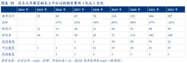 我们假设教育行业的广告投入与上市教育公司整体销售费用的变化趋势类似。可以看到教育在经过了 17~20 年四年广告投放的高速增长期后,于 21 年开始增速出现明显下滑,22 年增速进一步大幅下滑。增速剧烈变化的原因主因 “双减” 政策对 K12 教育的规范。