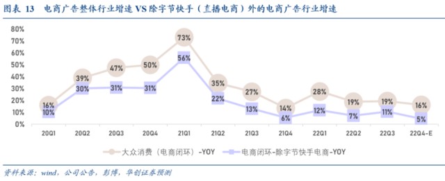 季度拆分:复盘疫情三年间电商广告增速变化,影响季度增速的核心因素主要有两方面。一是疫情:前期加速培养了用户的线上消费习惯,后期疫情防控升级通过影响物流影响电商 GMV。二是直播电商:以抖音电商/淘宝直播/快手电商为代表的直播电商模式自 20 年疫情开始后,以一种对下沉市场和高龄用户更友好的内容化购物形式更进一步地提升了用户渗透和购买频次。我们在图 13 中对比了电商广告整体增速和剔除抖音快手之后的电商广告增速,直播电商的兴起推高了电商广告大盘的增长。