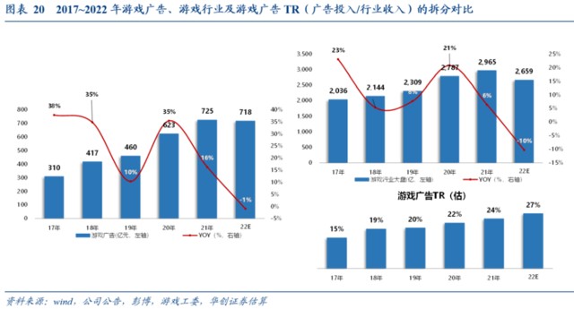 游戏广告 17~22 年的增长主要受益于行业的增长和广告 TR 的持续提升。最典型如 2020 年,受益疫情期间的宅家消费需求,游戏行业增速大幅提升至 21%,但整体来看受游戏版号政策限制、行业内生增速的逐渐放缓,行业规模增速已降至个位数左右水平。广告 TR 提升与过去几年买量的兴起、字节这类公司以更易投的工具产品降低游戏公司的投放门槛有关。