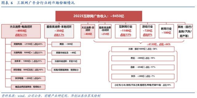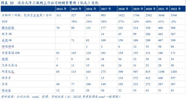 【数据说明:互联网行业的广告投放是线上广告中占比很高的一大子类,主要指互联网公司投向其他平台的广告费用(如阿里投在抖音上的广告)。但由于互联网公司的销售费用中包含人力成本和营销预算,且营销预算可能有海外市场的投放、线下或者苹果华为等应用市场的投放,因此互联网公司整体的销售费用要远大于投在互联网平台的广告费用。】