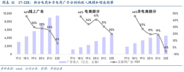 复盘过往六年的互联网广告大盘,从 17 年接近 3000 亿增长至 22 年近 9500 亿,复合增速 26%,远超名义 GDP 复合增速 8%。其中重点行业如电商闭环广告(预测 CAGR:34%,22 年占比 52%)、互联网行业广告(预测 CAGR:50%,22 年占比 12%)、游戏广告(预测 CAGR:18%,22 年占比 8%)贡献了互联网广告的核心基本盘。