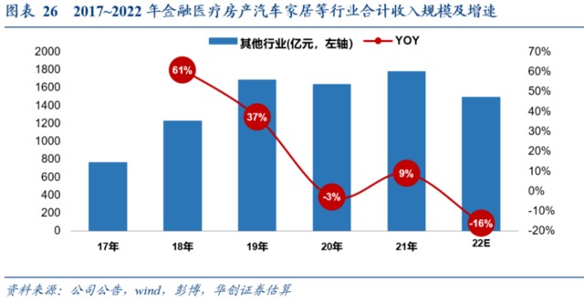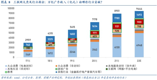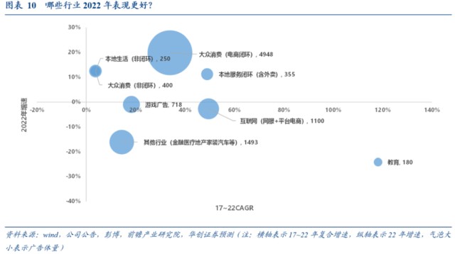 【数据说明:我们将除大众消费、服务消费、游戏、教育、互联网(网服 + 平台电商)外的其他子行业合计在一起进行分析,主要是金融、医疗、家居建材、汽车、地产等行业,2022 年总规模约在 1480 亿左右。考虑到对各行业规模和增速的分析有部分估算成分,所以这几大行业过去几年的增速与实际情况相比可能会有部分误差,但用于分析趋势仍有价值。】