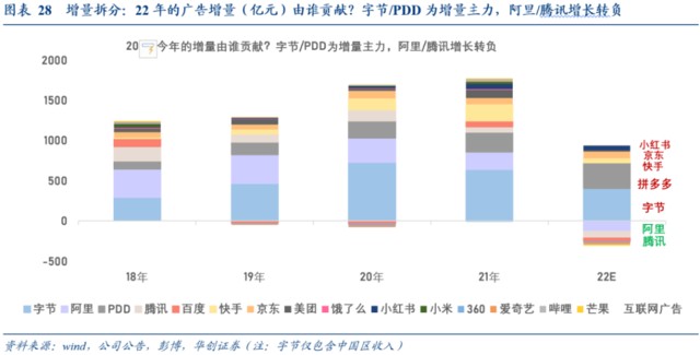 从增量来看:不同于往年头部广告玩家也贡献主要的广告收入增量,22 年头部玩家的表现出现了明显分化——阿里和腾讯广告收入首次转负;字节/拼多多为增量贡献主力,另外快手/京东/小红书也分别贡献了部分增量。