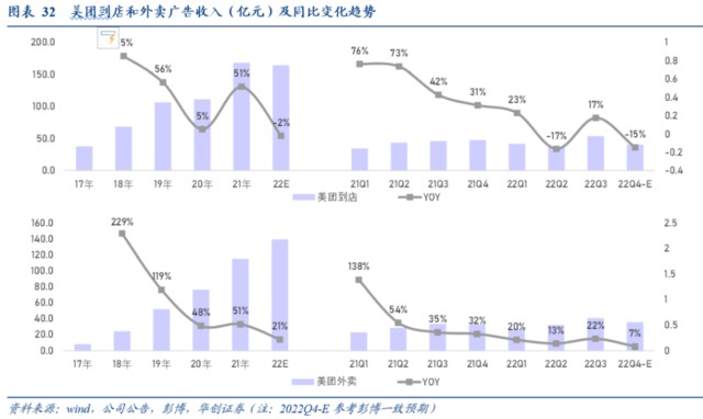 季度拆分:复盘疫情三年间本地服务广告的增速变化,可以观察到本地生活广告增速与社零强相关,波动比电商广告更加剧烈。根据历史数据可近似认为本地服务类广告是社零变化的放大器:在消费较差的 22Q2 和 Q4,本地服务广告增速也表现不佳,而在社零强势恢复的 21Q1,本地广告有更高的恢复弹性。但由于行业线上化率和广告整体货币化率的提升,本地生活广告又可以享受比社零明显更高的增速。如果拆分到店和外卖来看:外卖广告波动则比到店更加平稳。