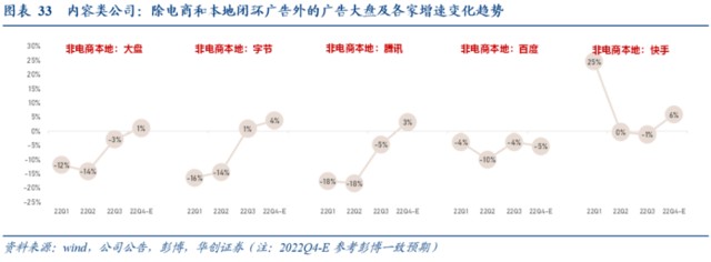 从行业景气度来看:23 年的广告增速预计将是本地>电商>外循环。但从竞争格局看:本地生活行业 23 年将是格局进一步恶化的一年,一方面抖音快速扩张,快手腾讯从 0 开始尝试,因此从竞争的角度考虑美团的收入增速和盈利实现均会面临一定压力;电商是竞争边际缓和的一年,主要体现在抖音直播电商增速开始放缓,接下来进入难度更大的货架领域,阿里的竞争压力边际上会有一定缓和,而京东和拼多多守住各自优势领域,竞争压力一直尚小;外循环广告虽然行业增速低,但仍有部分公司可以实现明显好于行业的成长性,如视频号渐入商业化的腾讯。因此综合分析:本地广告虽然行业景气度高但格局在恶化,建议谨慎;电商广告景气度不错,且阿里边际企稳,拼多多仍在快速成长;外循环广告虽然行业增速一般,但如腾讯边际明显改善,快手商业化管理层换届后也有望能有新突破。