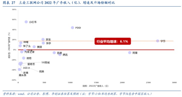 【数据解释:本文的分析范围仅限于互联网广告,未包含电视/梯媒/户外/报刊等线下广告,但考虑到目前互联网广告已占广告行业整体收入的 80% 以上,对互联网广告的研究对理解广告行业整体仍有较大意义。我们选取广告收入排名前 20 余家互联网公司(字节/阿里/拼多多/腾讯/百度/快手/京东/美团等)的广告总收入近似代表互联网广告大盘,其中字节和小红书等非上市公司相关数据为我们按照一定逻辑估算或预测值。未包含在内的平台如新浪新闻/网易新闻/苹果应用商店等,主因规模太小或数据不可得。考虑到互联网广告头部效应极强,我们认为该近似相对合理。】
