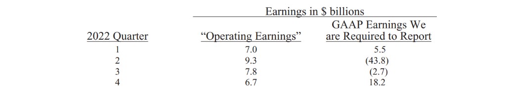 伯克希尔在 2022 年表现不错。公司调整后的营业利润(operating earnings)——我们使用公认会计原则(“GAAP”),不包括持有股票的资本利得——创下了 308 亿美元的历史新高。查理和我专注于这个实际数字,并建议你也这样做。不过,如果没有我们的调整,GAAP 数据在每个报告日都会剧烈波动。请注意它在 2022 年的波动,这并不罕见: