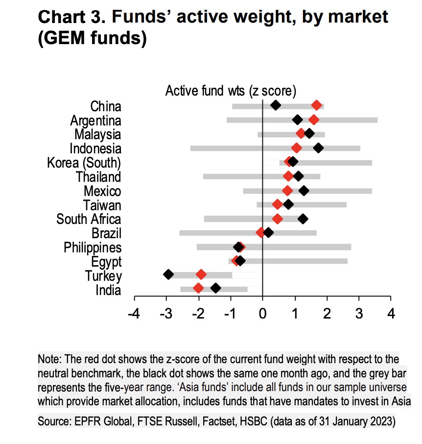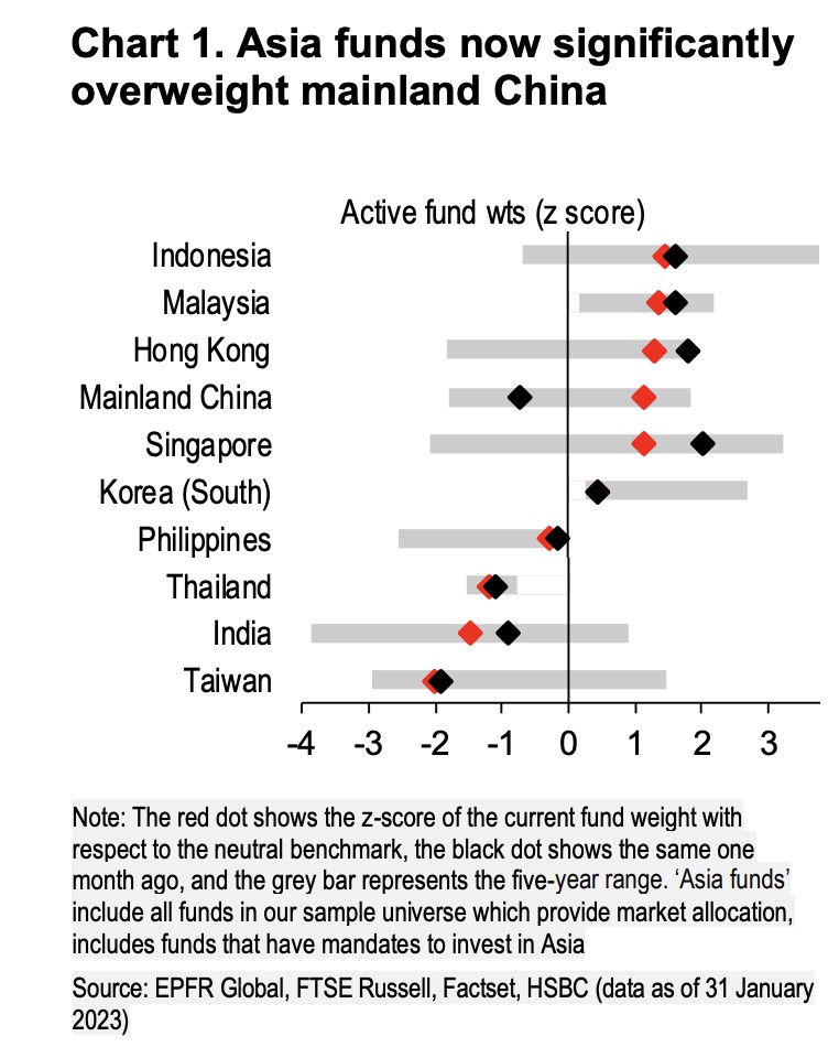 汇丰亚太地区股票策略主管 Herald van der Linde 领导的团队在 2 月 27 日的报告中指出,过去一个月,他们发现市场上亚洲和新兴市场基金大幅增加了对中国股票的敞口,现在显著 “高配” 中国股票,报告指出: