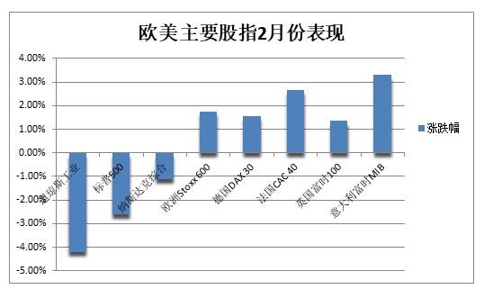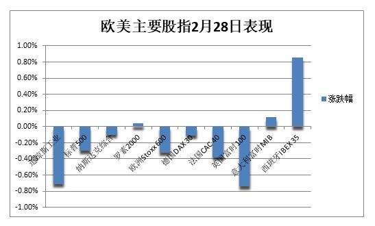 周二欧股普跌,仅意大利股指收涨。昨日涨超 1% 的泛欧 Stoxx 600 指数收跌 0.32%,从一周高位回落,医疗保健股跌 1.5% 领跌,银行股尾盘转涨 1.4%,2月该股指累涨 1.75%,为五个月里第四个月累涨。欧元区 Stoxx 50 指数 2 月累涨 1.8%。