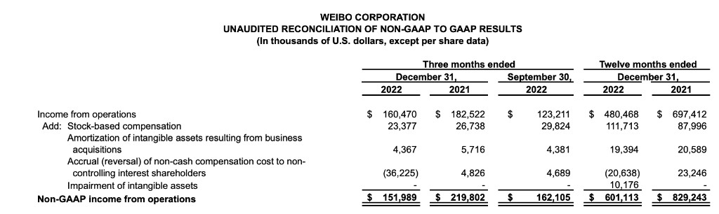 "2022 年充满了挑战,我们不断优化运营效率使微博社区保持健康与稳定,我们很高兴看到今年取得的成过,2022 年非美国通用会计准则运营利润率达到 33%。随着 2023 年的到来,我认为微博将获得更高的广告收入,并通过我们的生态系统为广告客户创造价值。”