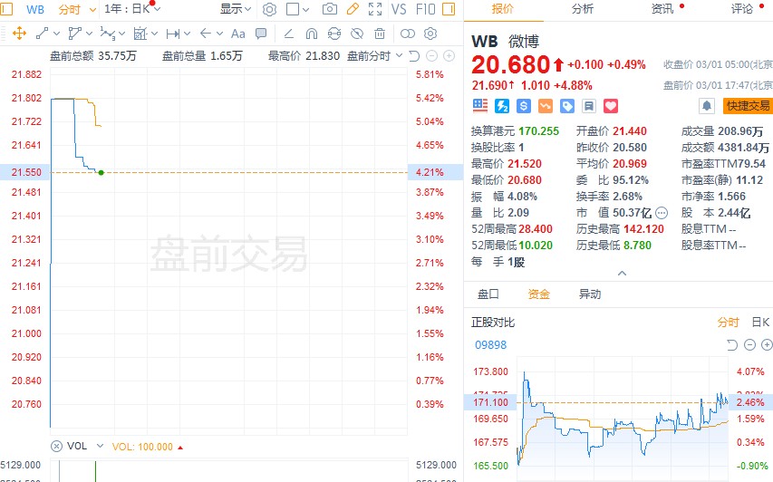 财报发布后,微博美股盘前涨近 5%,至 21.690 美元。