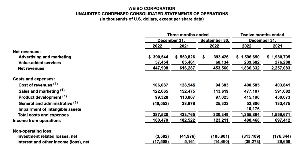 微博 2022 年四季度净营收 4.48 亿美元,同比下降 27%,略高于市场预期的 4.461 亿美元;广告和营销收入为 3.905 亿美元,同比下降 29%,超市场预期 3.853 亿美元。