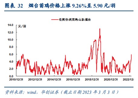 2023 年以来,受养殖端盈利预期向好、市场补栏需求旺盛影响,鸡苗价格不断上涨突破高位:3 月 6 日烟台地区大场报价达到 6.2 元/羽,环比上周上涨 0.3 元,同比上涨约 500%,其中益生股份报价已突破至 6.5 元/羽。