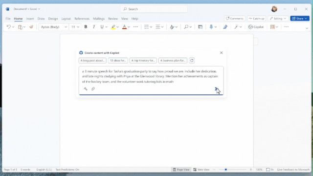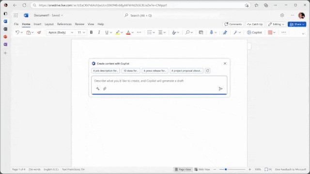 只需一个简短的提示,Copilot 就能创建一个初稿,并根据需要从整个组织中调入信息。