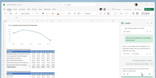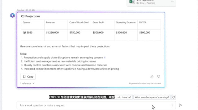 比如,Copilot 可以在 Excel 数据中找到趋势,根据过去的信息生成电子邮件,根据你工作过的其他文件创建 PowerPoint 设计。