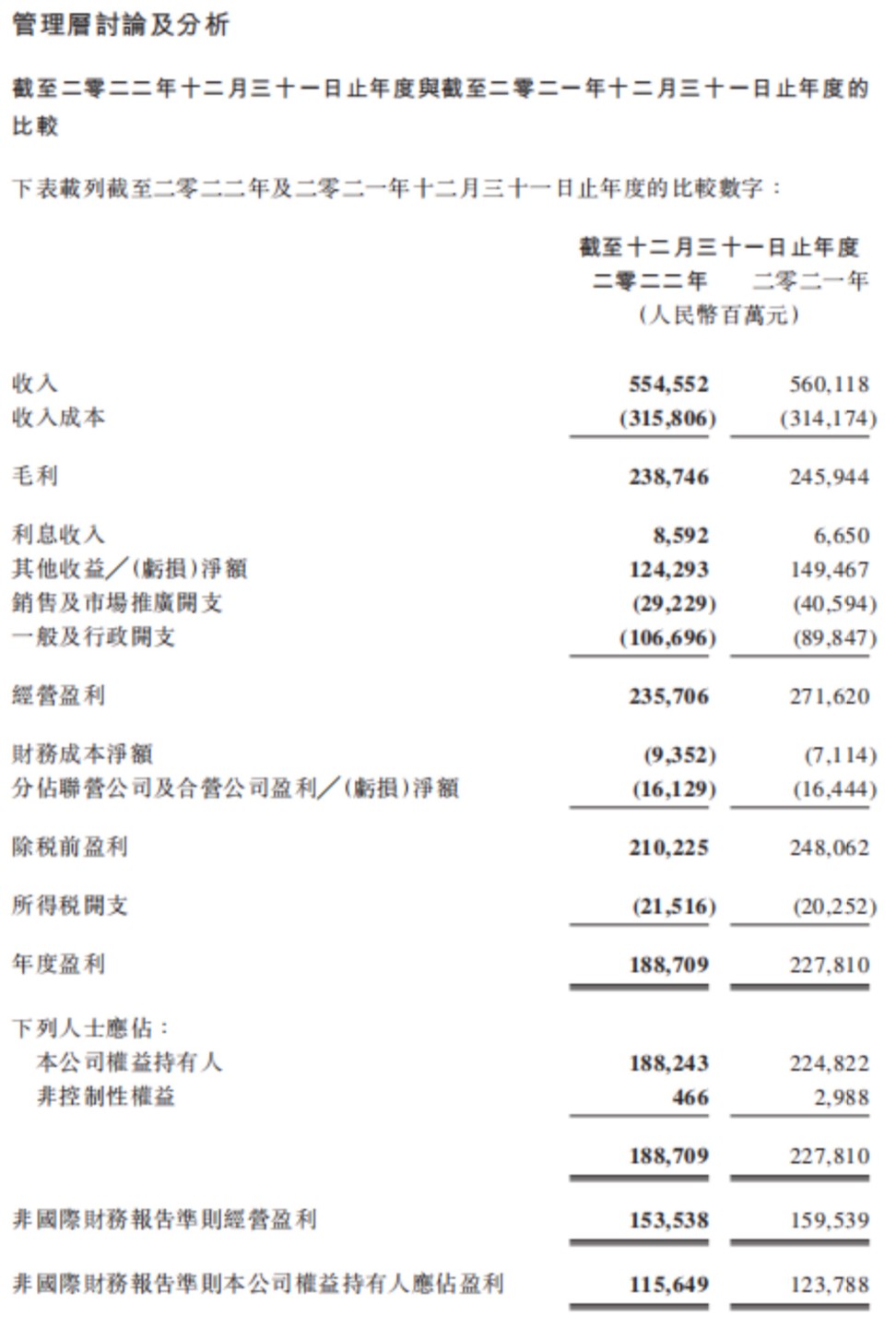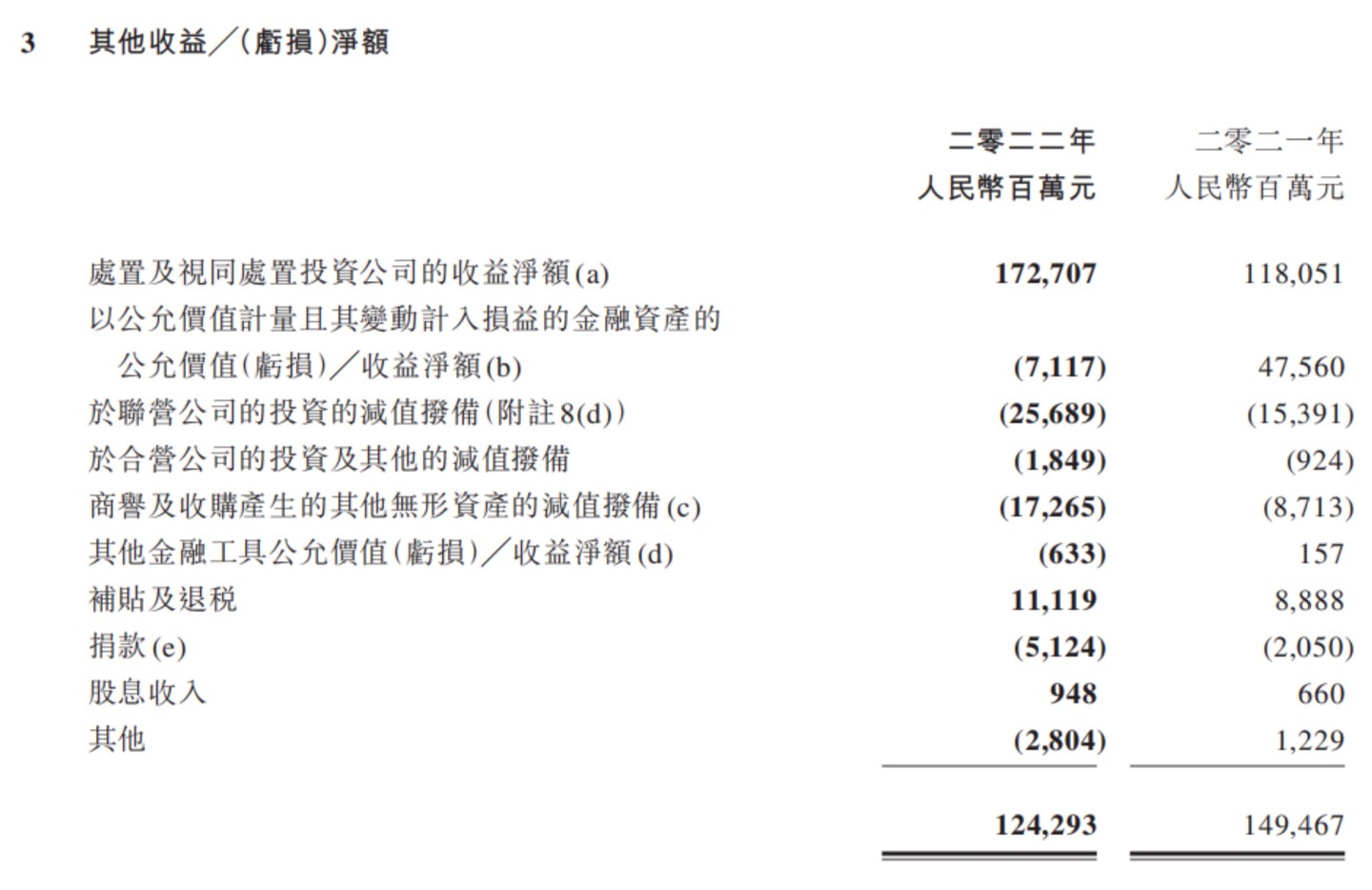 根据年报披露,2022 年,腾讯控股其他收益╱(亏损)净额为 1243 亿元,2021 年为 1495 亿元,都占经营利润超过一半,主要来自 2022 年分拆美团和 2021 年分拆京东给已有股东产生的一次性收益。