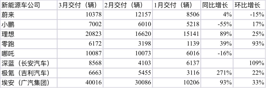 4 月 1 日,中国造车新势力陆续公布 2023 年 3 月的成绩单,从同在纽交所和港交所上市 “蔚小理”(蔚来、小鹏、理想)的表现来看,三家车企均仅达到其交付指引的下限,其中,理想汽车从今年以来坐稳造车新势力新车交付第一位。另外,传统车企旗下 “新二代” 车企表现出色,广汽集团旗下埃安销量突破 4 万辆大关,长安汽车旗下刚宣布独立运营的深蓝汽车(原长安深蓝)3 月销量翻番,吉利汽车旗下极氪也在快速增长。