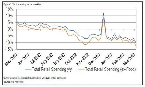 上月,花旗银行披露的第三周信用卡支出数据显示,美国零售支出总额出现了自 2020 年 4 月以来的最大降幅。